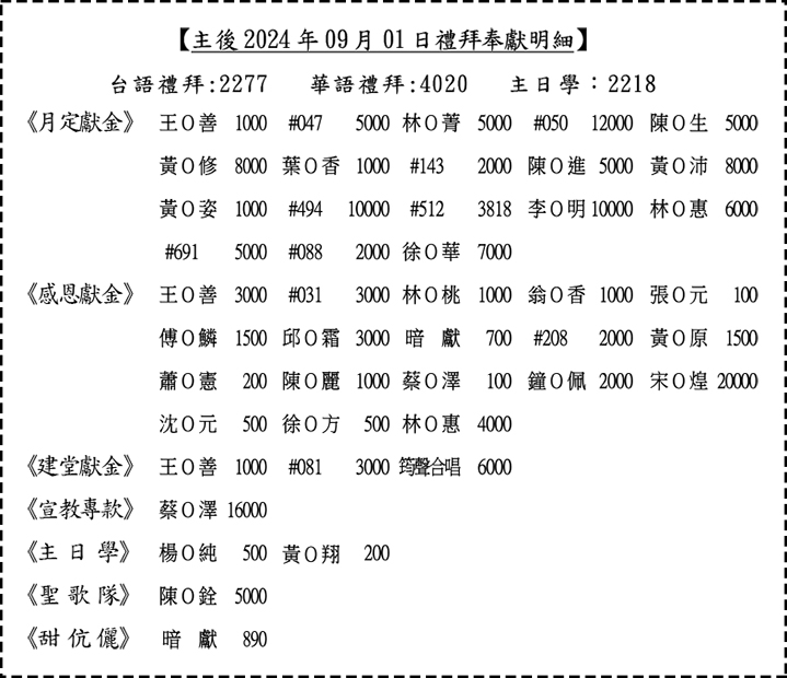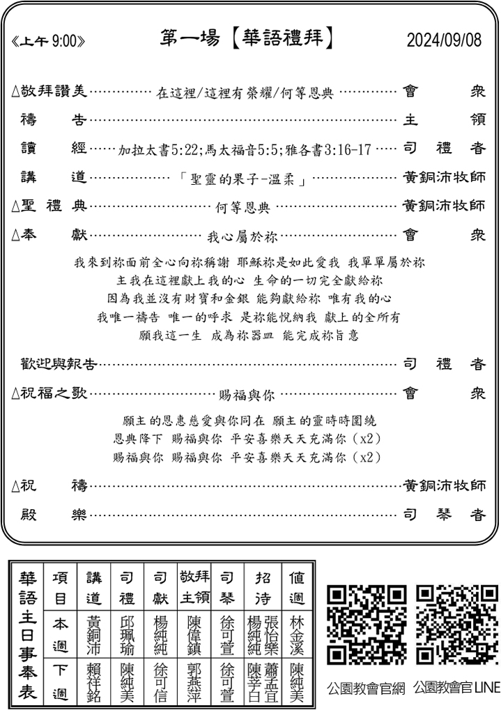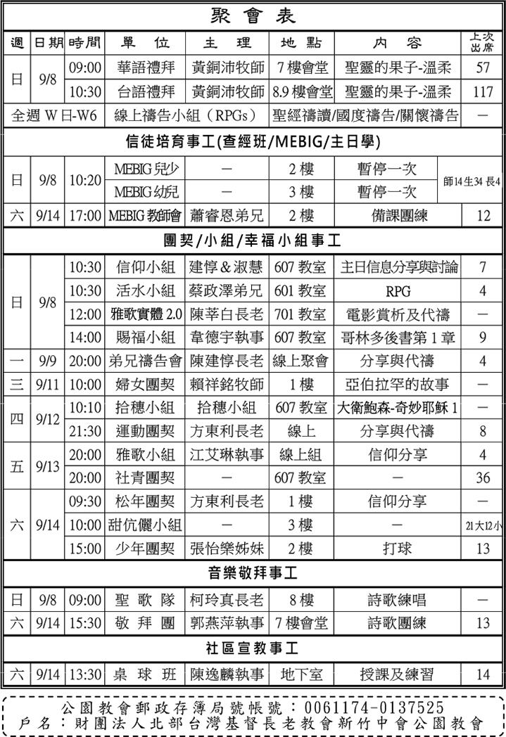 - 本主日(9/8)台語禮拜後(12:20)召開長執會,敬備午餐茶點,請至七樓用餐。