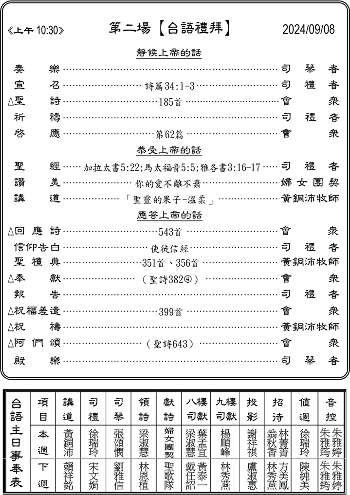 - 本主日(9/8)台語禮拜後(12:20)召開長執會,敬備午餐茶點,請至七樓用餐。
