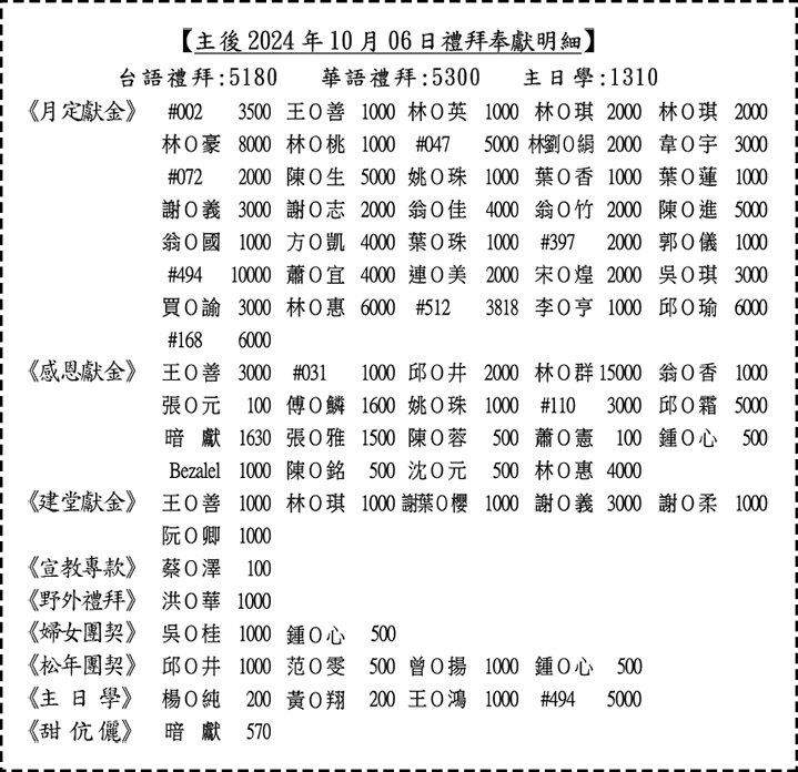- 下週主日(10/20)禮拜前請於一樓登記出席;請現任長執協助選務工作。