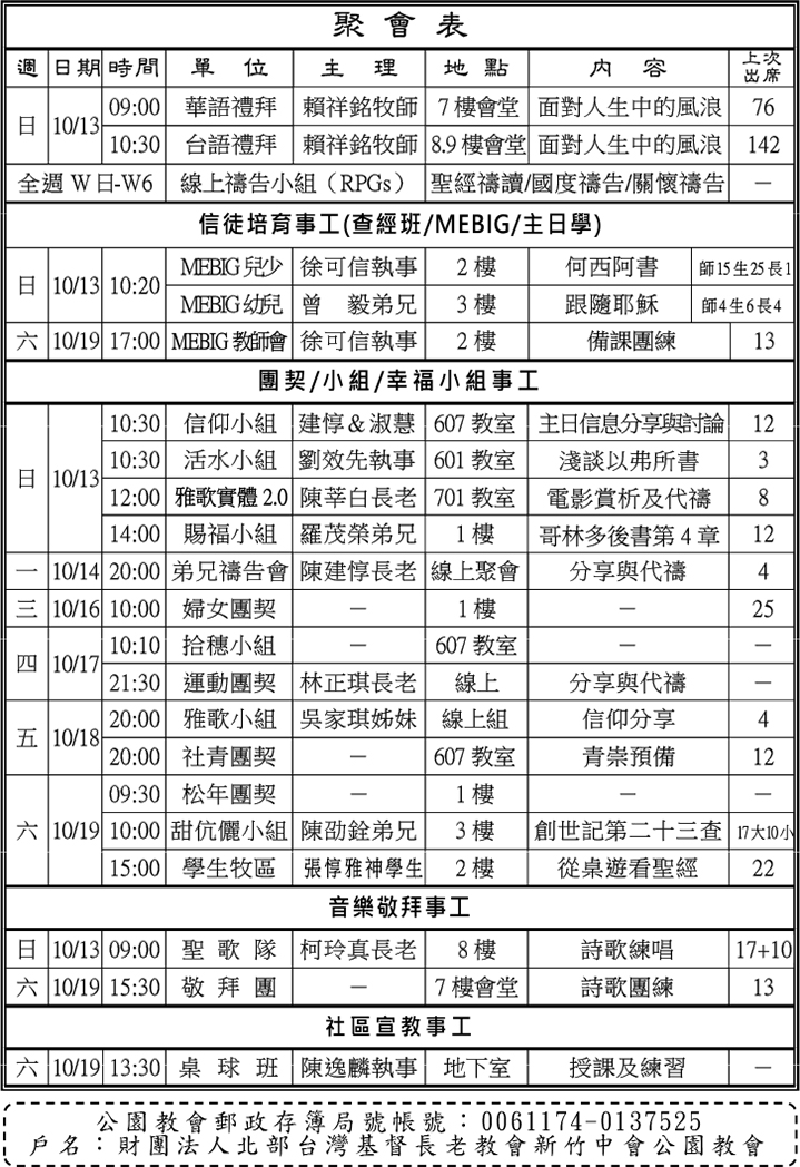 - 本主日(10/13)歡迎台中復興教會社青(7大2小)蒞臨參加台語禮拜。