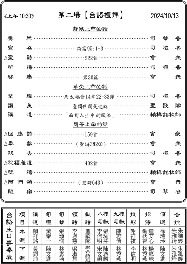 - 本主日(10/13)歡迎台中復興教會社青(7大2小)蒞臨參加台語禮拜。