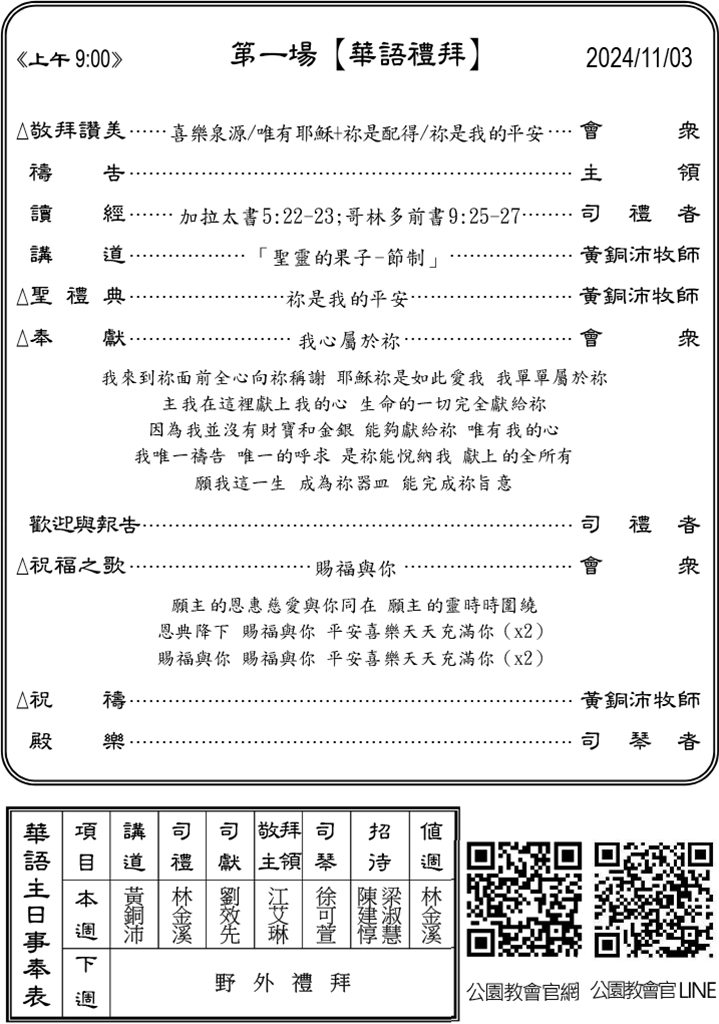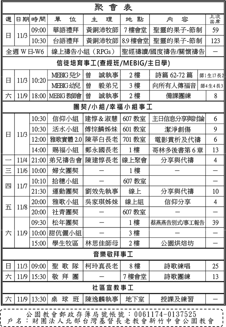 - 本主日(11/3)兩堂禮拜中舉行聖禮典,請兄姊預備心。