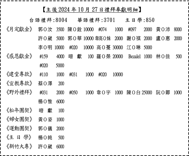 - 2025年事工研討會訂11/16(六)於本會召開,請各事工組開始擬定2025年事工計劃及預算。
