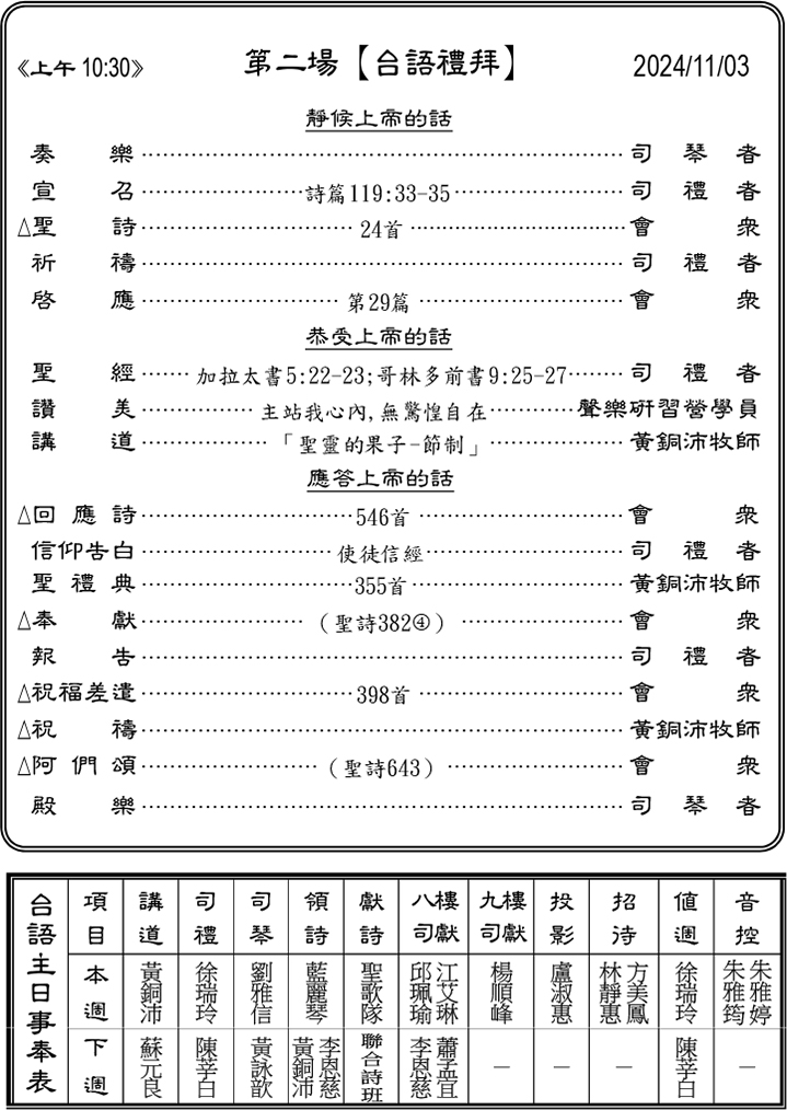 - 本主日(11/3)兩堂禮拜中舉行聖禮典,請兄姊預備心。