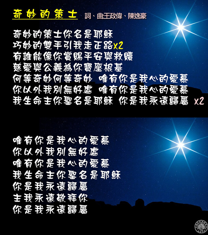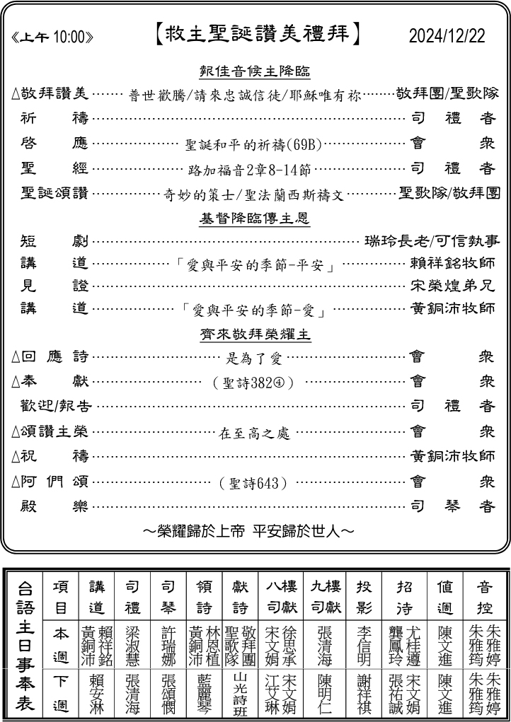 - 本主日(12/22)上午10:00舉行救主聖誕讚美禮拜,兩堂禮拜聯合舉行。歡迎兄姊闔家蒞臨,共渡聖誕佳節,同享主耶穌救恩之樂。