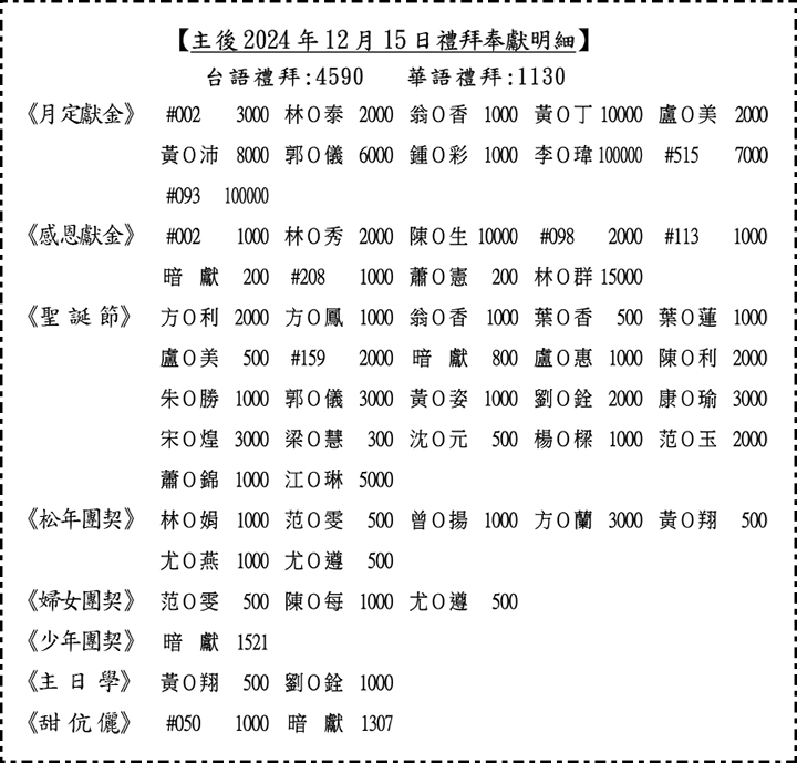- 財務組:1)請兄姊於12/29(日)前完成2024年度奉獻。2)事工團隊請於12/29(日)前完成2024年度結帳作業,願上帝賜福大家。