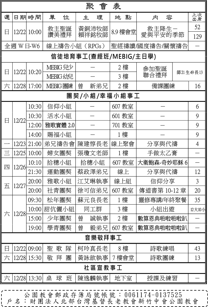 - 本週二(12/24)晚上7:00舉行聖誕平安禮拜,晚上8:00舉行報佳音活動,歡迎參加。※若有社區願意安排報佳音活動,請洽陳純美長老。
