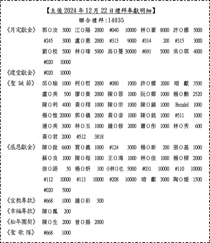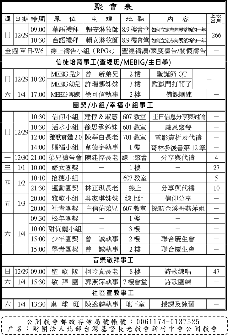 - 財務組:請兄姊於本主日(12/29)完成個人奉獻;事工團隊完成年度結帳作業,願上帝賜福大家。