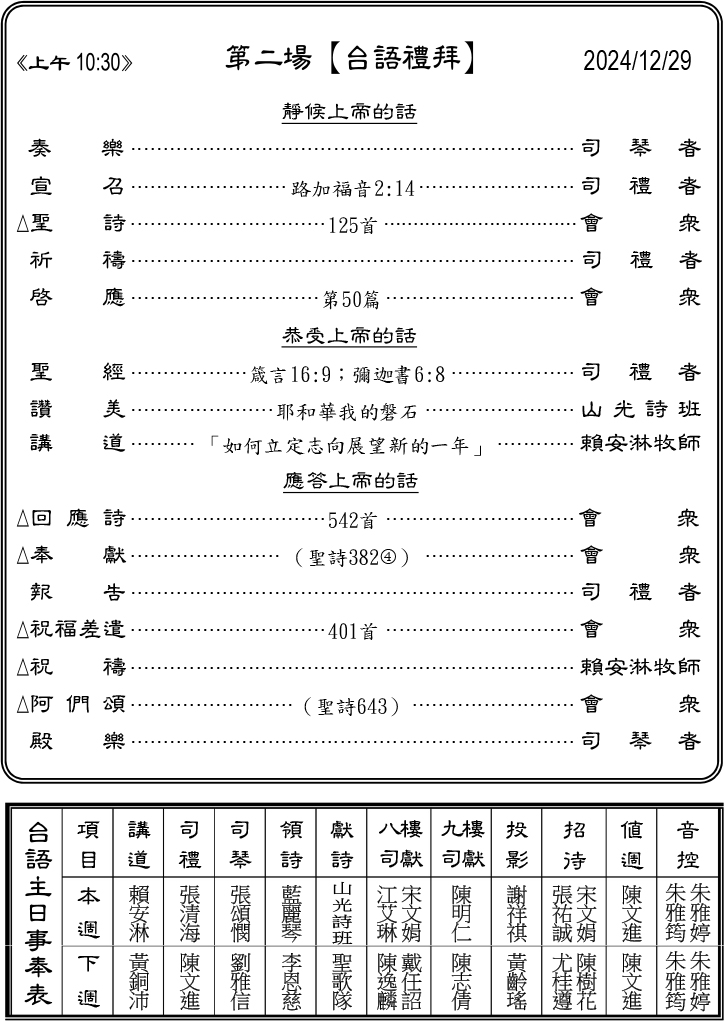 - 下週主日(2025/1/5)台語禮拜中舉行長老、執事暨事工團隊首長就任。☆