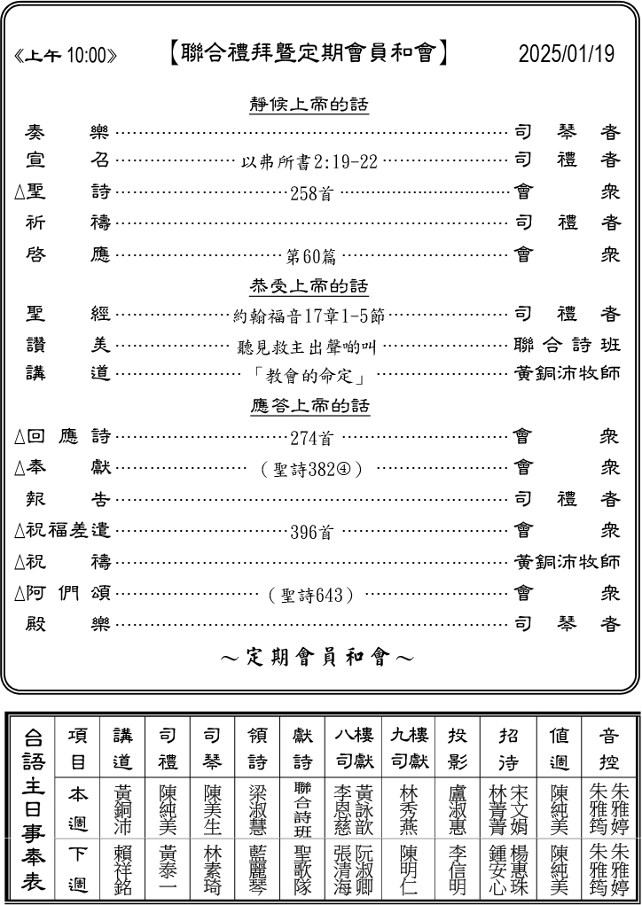 - 本主日(1/19)召開2025年定期會員和會,聯合禮拜時間/上午10:00。☆