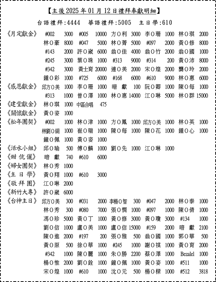 - 依個資保護法,2025定期會員和會手冊以編號登載個人奉獻,個人名字與編號對照請看一樓公佈欄(公佈一週),或洽詢玉珊幹事與財務組同工(正琪長老/文娟、信明執事)。不便之處,請兄姐見諒。