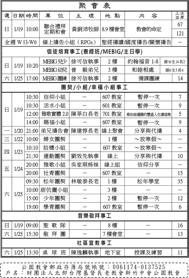 - 「公園教會五餅二魚」週六愛餐,時間/18:00-19:00;敬拜團/18:30。招募團膳服事同工,請洽組長藍麗琴姊妹;歡迎兄姊為愛餐專款奉獻。
