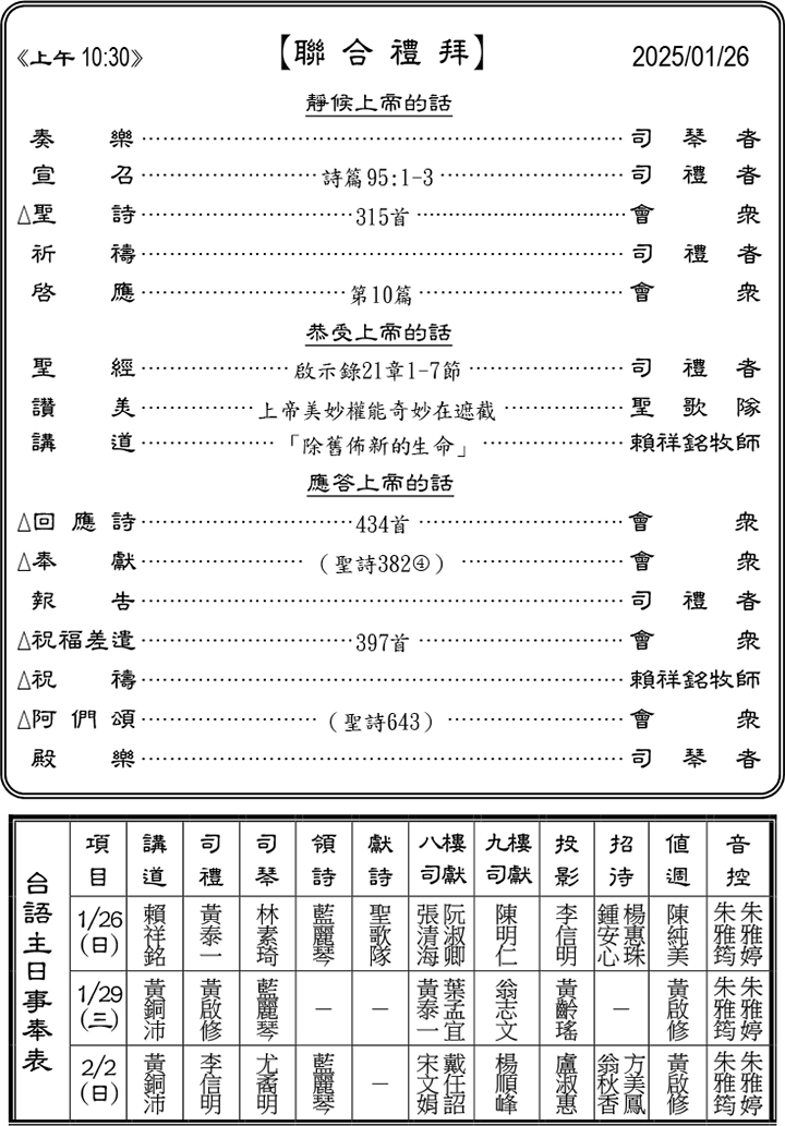 下週主日聯合禮拜預告(2月2日) 上午10:30