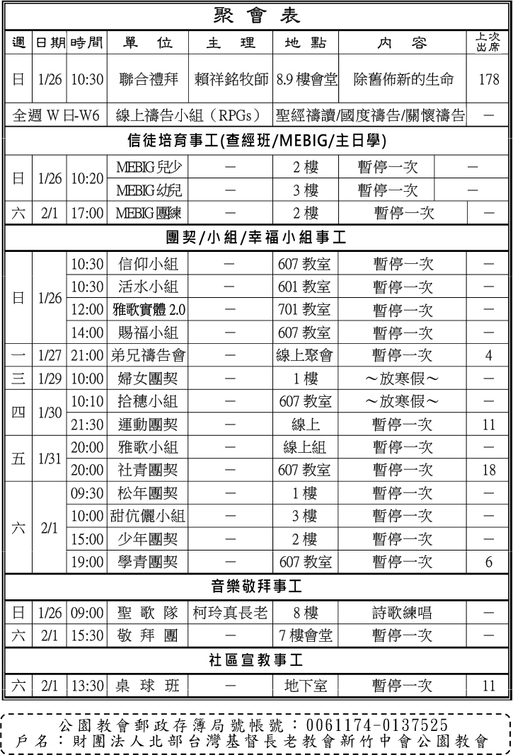 新春稱謝禮拜預告(1月29日)上午10:00