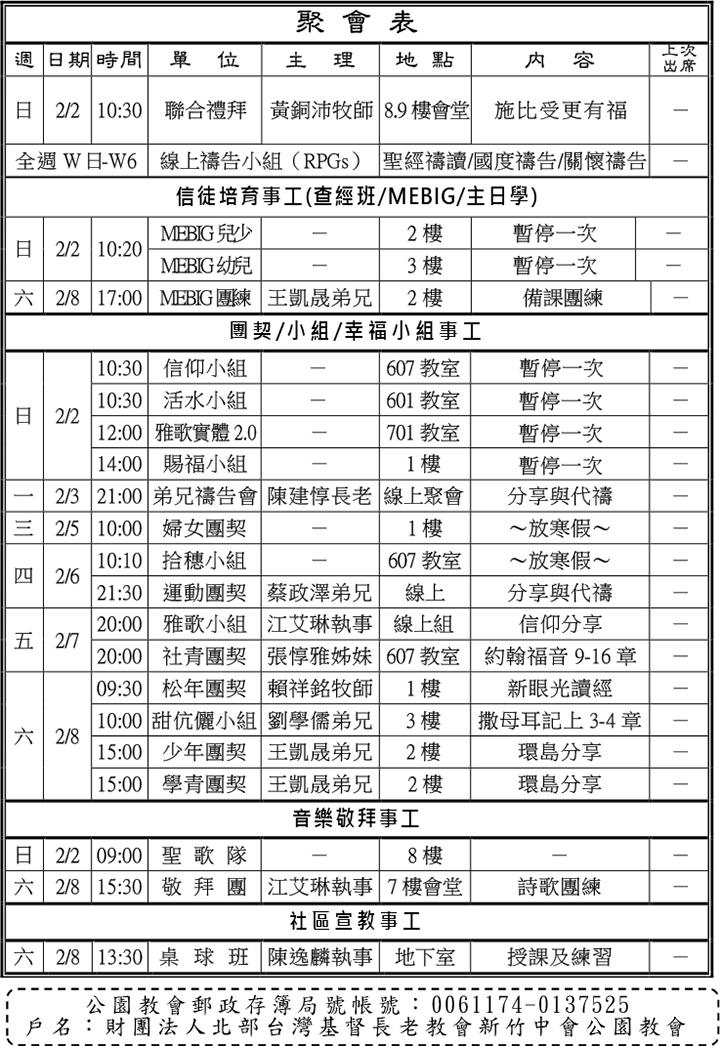 - 定期小會:預定本週六(2/8)晚上7:00於601教室召開,請長老撥冗出席。