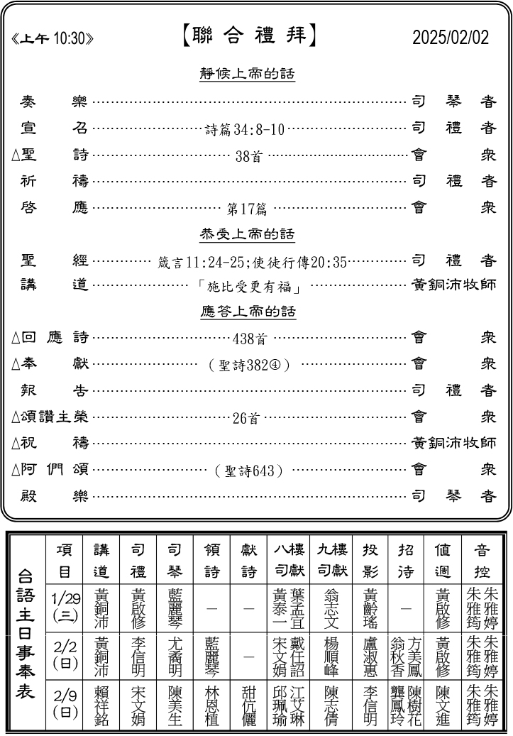 下週主日兩堂禮拜預告(2月9日)