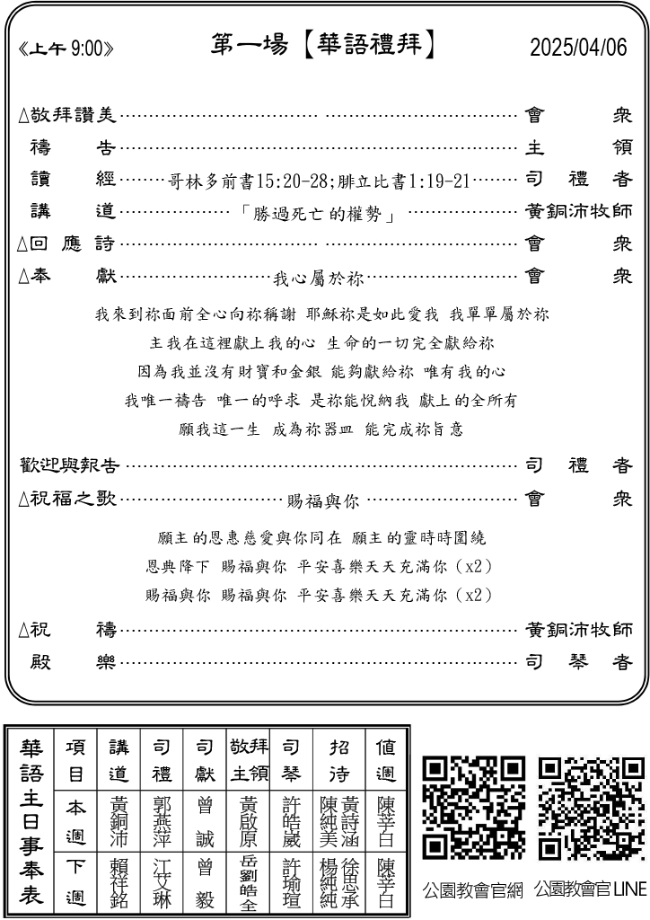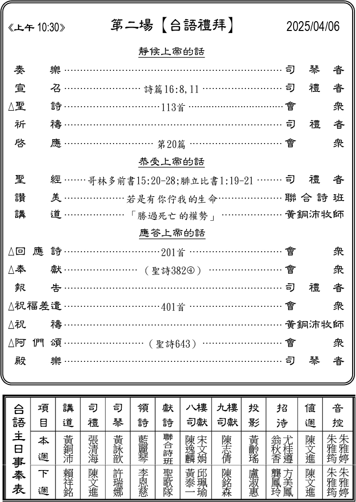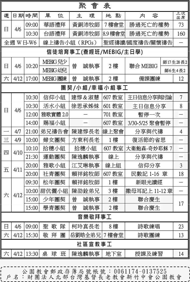 下週主日兩堂禮拜預告(4月13日)