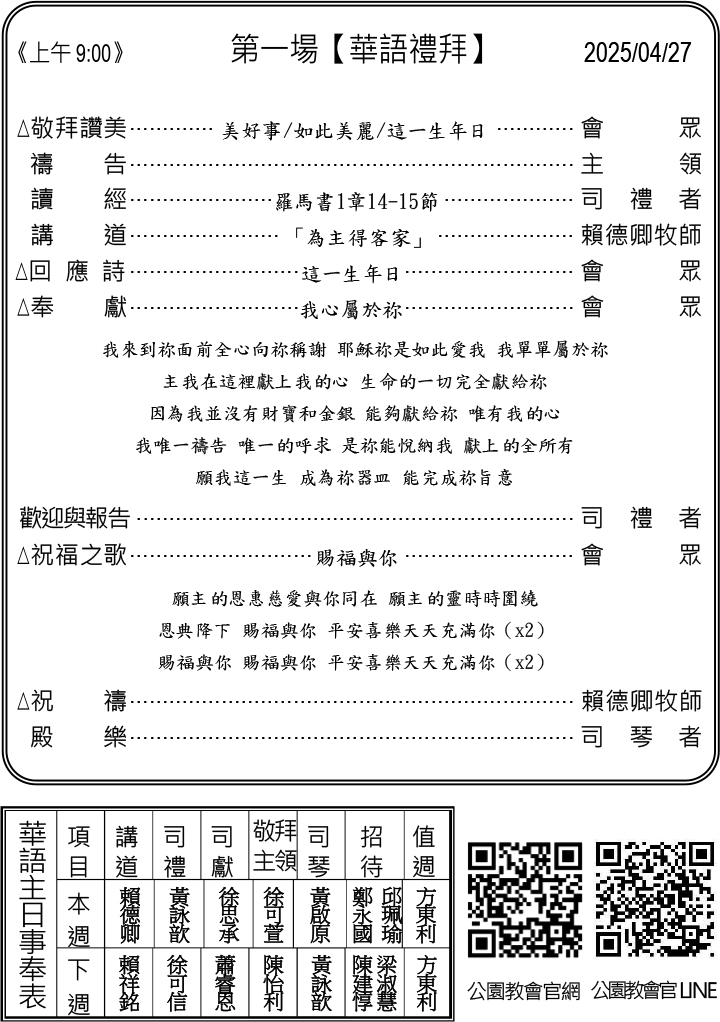 - 本主日(4/27)歡迎賴德卿牧師蒞臨,於兩堂禮拜講道並分享客宣中會事工,請兄姊為客宣中會關懷奉獻。※賴德卿牧師現任客家宣教中會總幹事。☆