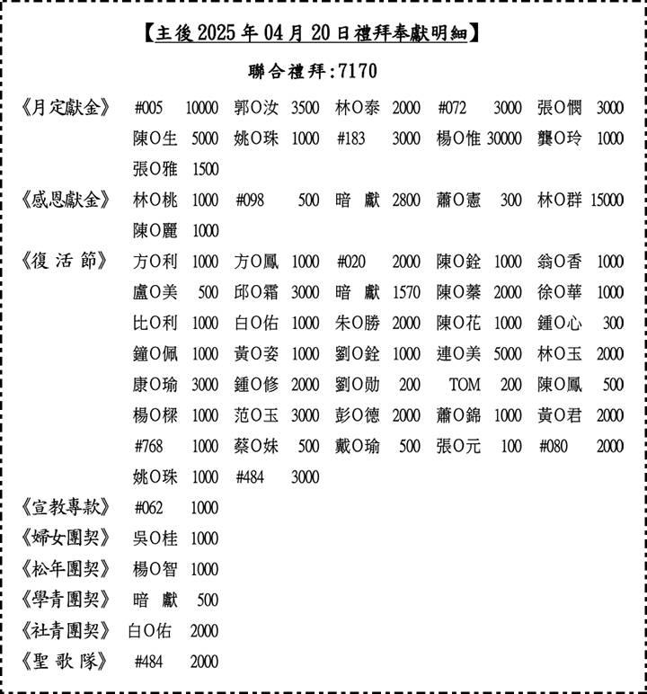 - 長執會:下週主日(5/4)下午12:30於七樓副堂召開,請長執撥冗出席。☆