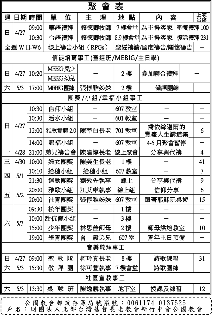 - MEBIG教師會本主日(4/27)下午12:30-13:30於2樓舉行,主理:賴祥銘牧師,請MEBIG教師同工參加。