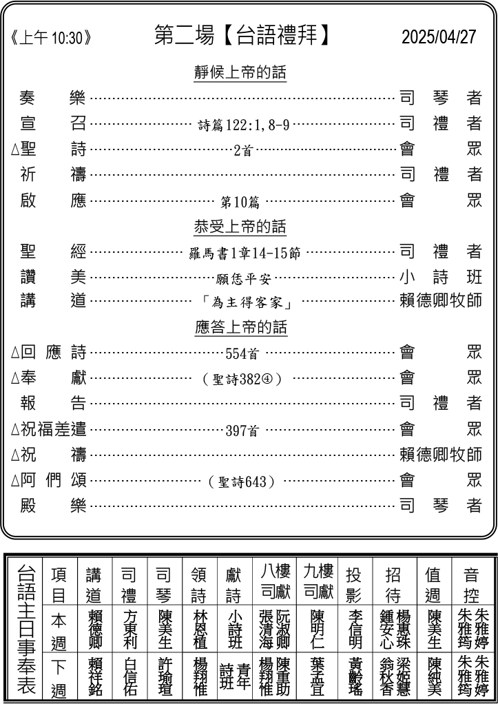 - 本主日(4/27)歡迎賴德卿牧師蒞臨,於兩堂禮拜講道並分享客宣中會事工,請兄姊為客宣中會關懷奉獻。※賴德卿牧師現任客家宣教中會總幹事。☆