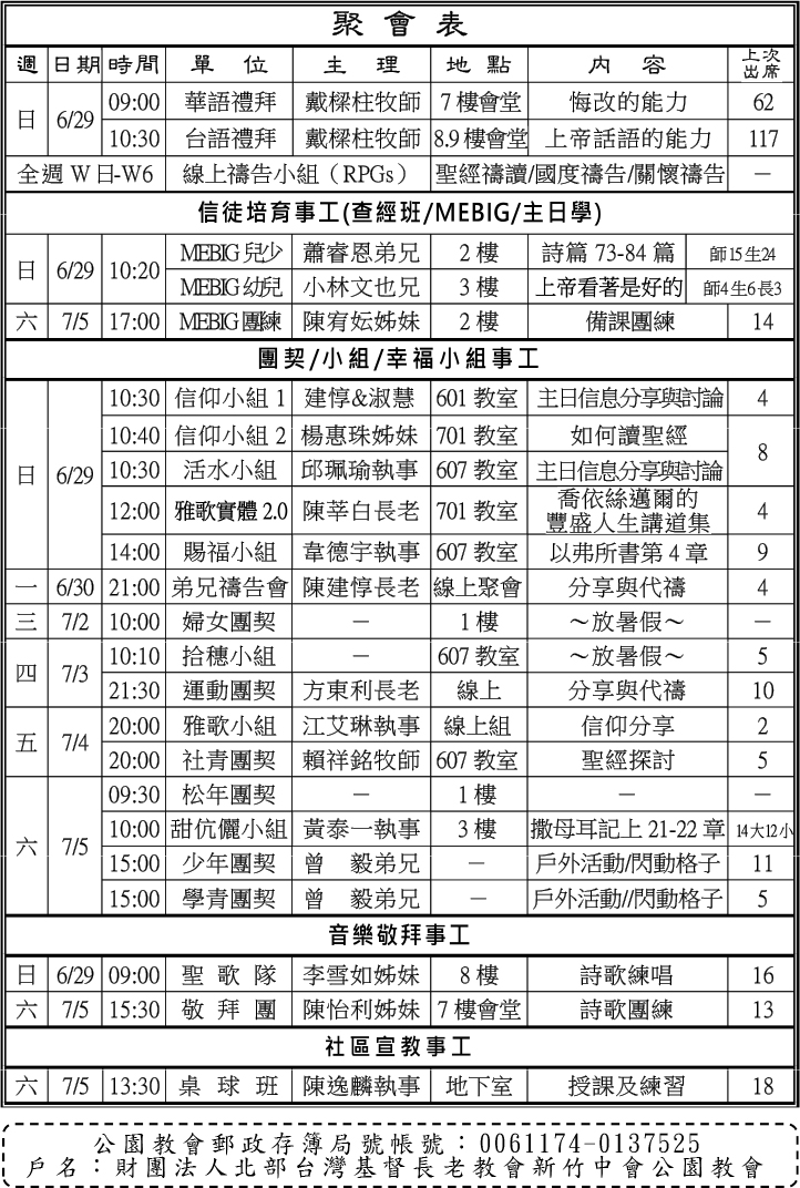 - 本主日(6/29)下午12:30於2樓舉行MEBIG教師會,主理:賴祥銘牧師。