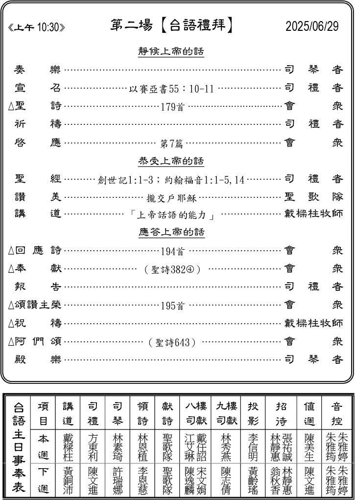 本主日(6/29)兩堂禮拜不同信息,請預備心領受信息。