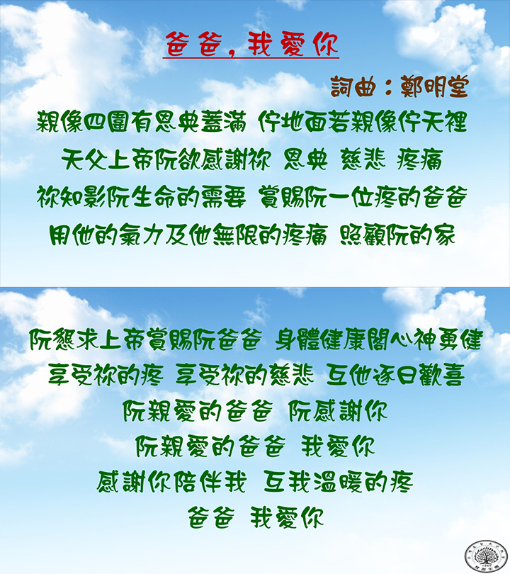 ※本主日(8/3)上午11:30於教會1樓舉辦父親節特別活動,歡迎爸爸們參加。