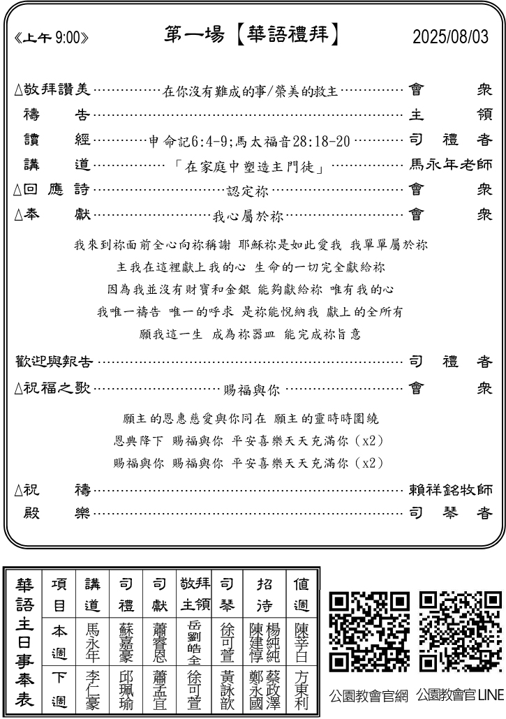 - 本主日(8/3)為父親節感恩禮拜,邀請馬永年老師於兩堂禮拜講道《在家庭中塑造主門徒》。下午13:00-15:00專題講座《家庭信仰的傳承》,主理:馬永年老師、梁婉華老師夫婦,地點:7樓副堂。☆