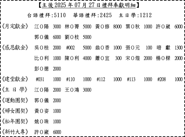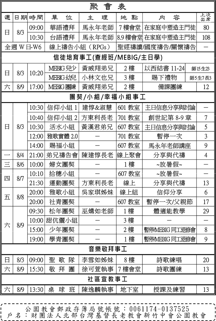 - MEBIG同工退修會8/8-10假宜蘭五結教會舉行,8/10(日)參加五結教會禮拜。※8/10公園教會2-3樓兒少禮拜暫停,請親子參加華語或台語禮拜。