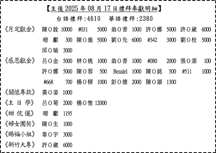 - 傅悰鱗傳道師會籍轉至壽山中會復興教會。(2025/8/13轉出)