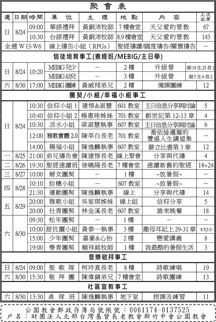 - 主日學MEBIG本主日(8/23-24)於2樓舉行升級營。