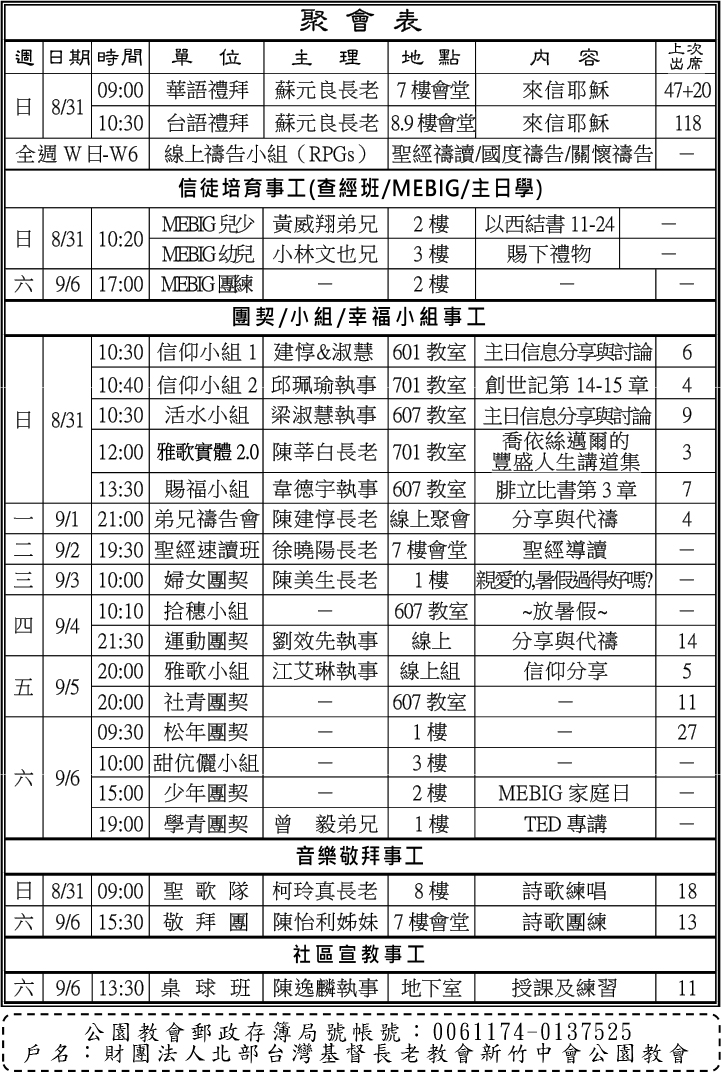 - 本主日(8/31)下午12:30於二樓舉行MEBIG教師會,主理:賴祥銘牧師。
