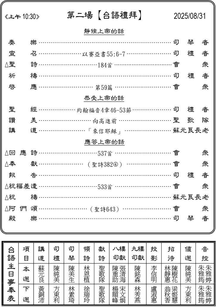 - 本主日(8/31)感謝蘇元良長老於兩堂禮拜講道。☆