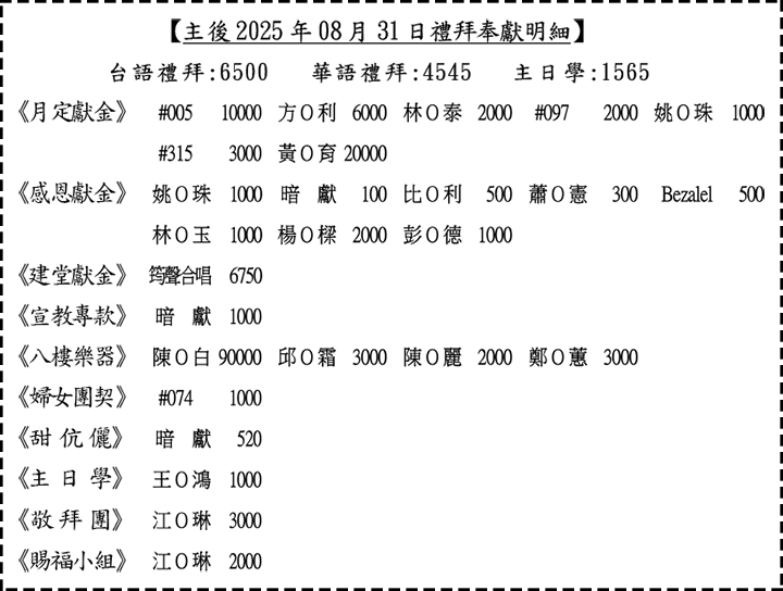 - 八樓講台工程完工後(預訂11月初),配合華語禮拜移至8樓,已訂購一套全新樂器,預算33萬元,並設置「八樓樂器專款奉獻」,請兄姊關心奉獻。☆