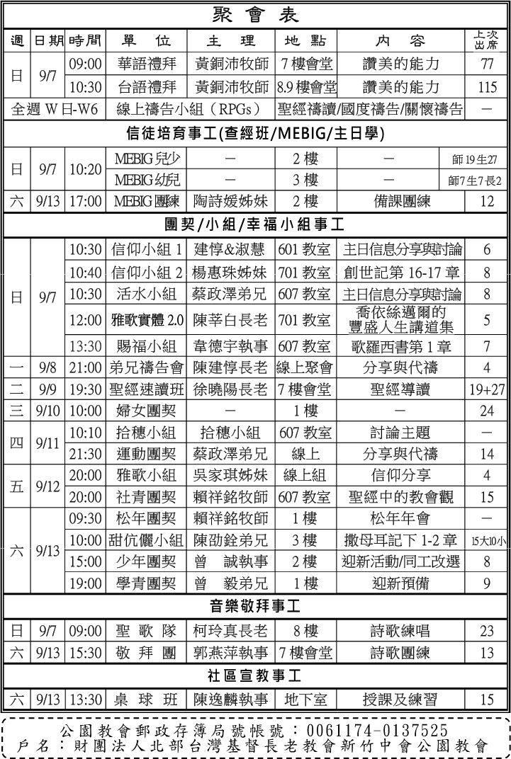 - 本主日(9/7)2、3樓兒童禮拜暫停一次,請親子參加華語或台語禮拜。