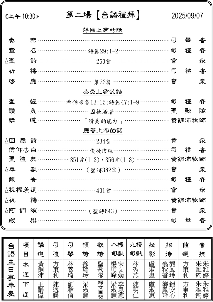 ※台語禮拜前請先於一樓等候入場;詩班請至三樓練唱並穿聖歌隊服。