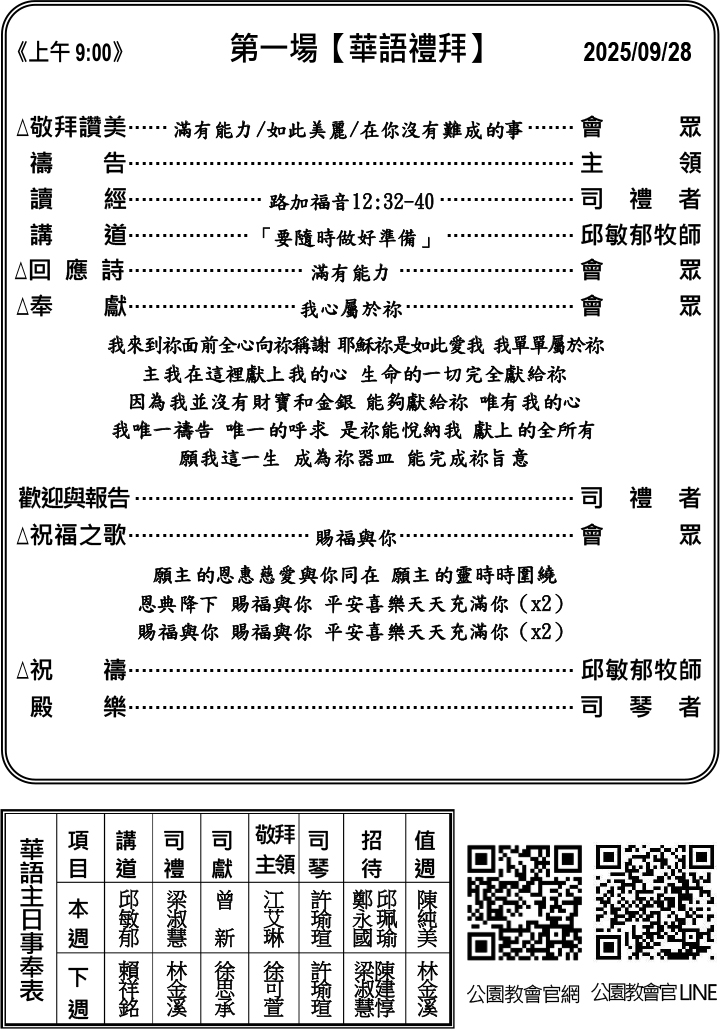 - 第四季(10-12月)主日事工輪值表已印好,請於一樓自行取用。若需調整,請洽李玉珊幹事。