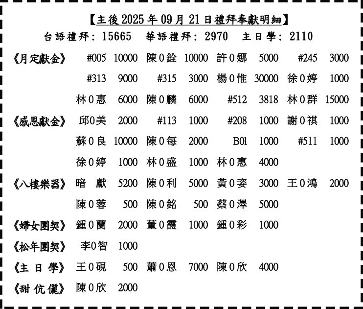 - 華語禮拜11月移至8樓,教會購置敬拜團全新樂器,預算33萬元,財務組設置「八樓樂器專款奉獻」,請兄姊關心奉獻。