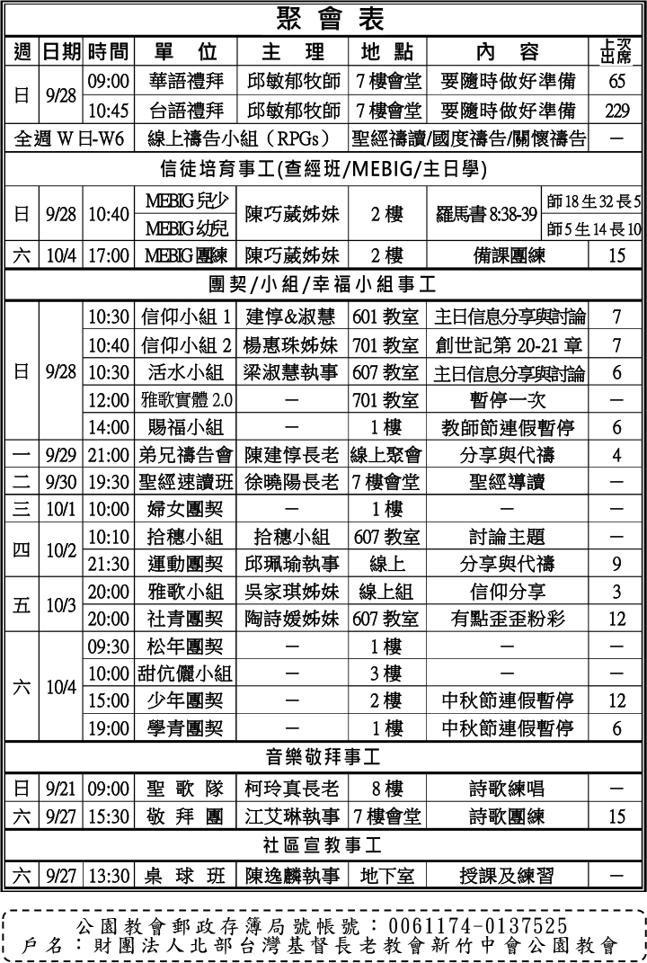 - 新竹中會教育部10/10-11(五-六)舉辦「信仰教育論壇」,專題「重燃熾熱的心」、「在詩篇中與主相遇」+「在大自然中與主同在」,報名費1200元,請向幹事登記報名。