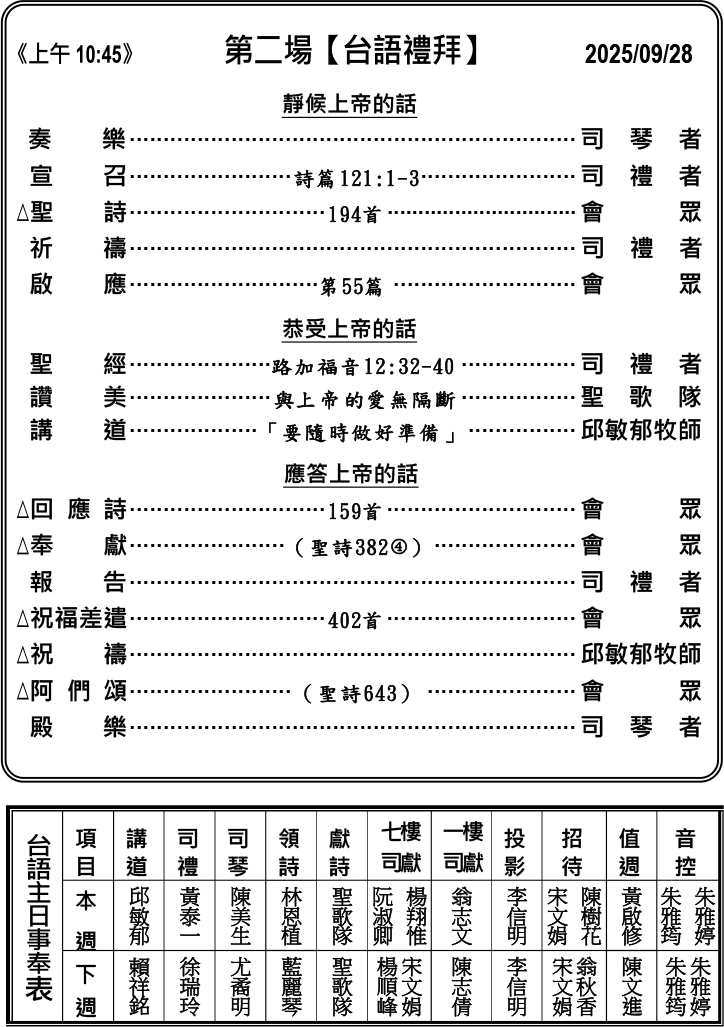 - 第四季(10-12月)主日事工輪值表已印好,請於一樓自行取用。若需調整,請洽李玉珊幹事。
