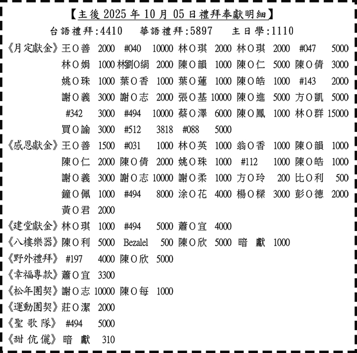- 2025野外禮拜11/2(日)假獅潭教會舉行,報名簡章置於一樓,歡迎兄姊邀請慕道BEST參加,請填寫報名表投入一樓報名箱。※請兄姊為野外禮拜專款奉獻。