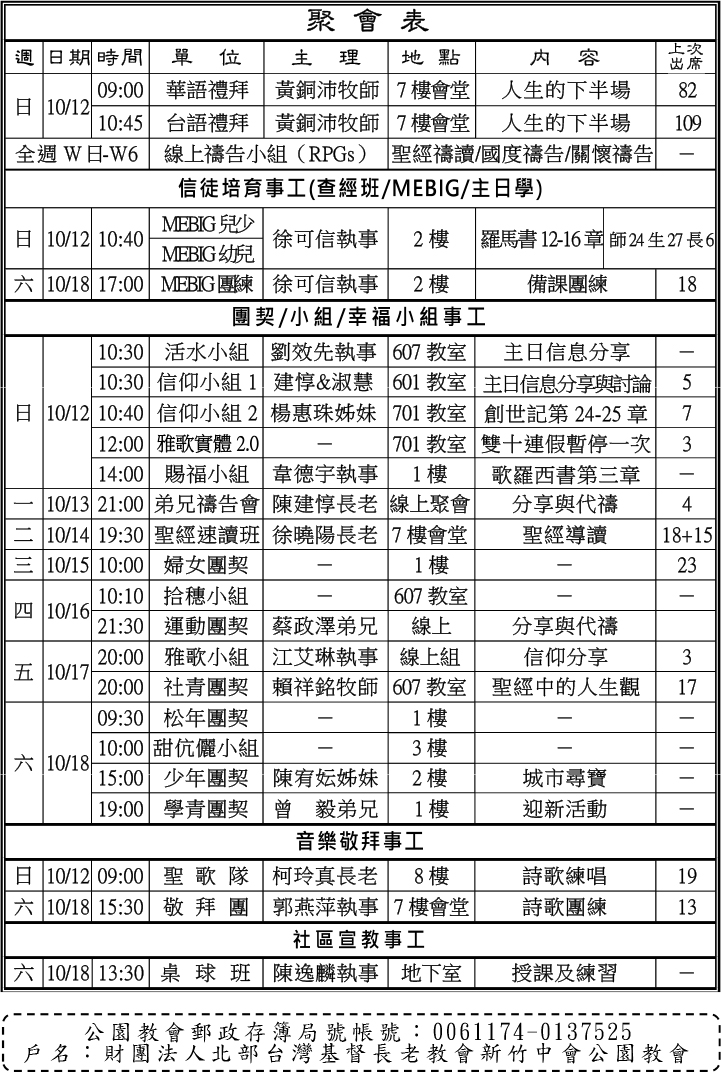 - 新竹中會中區簿冊檢查本週六(10/18)上午9:30-12:00於新竹教會舉行。