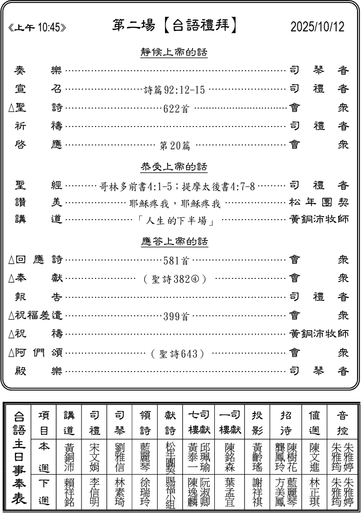 - 本主日(10/12)為松年事工主日,由松年團契獻詩讚美。原訂發放敬老禮券延至八樓工程結束,恢復八樓主日聚會後發放。