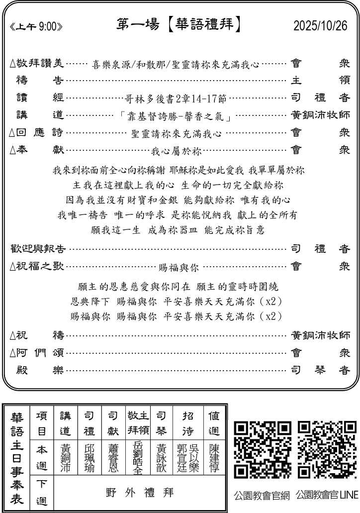 5)下週主日(11/2)公園教會光復路會堂暫停主日禮拜一週。