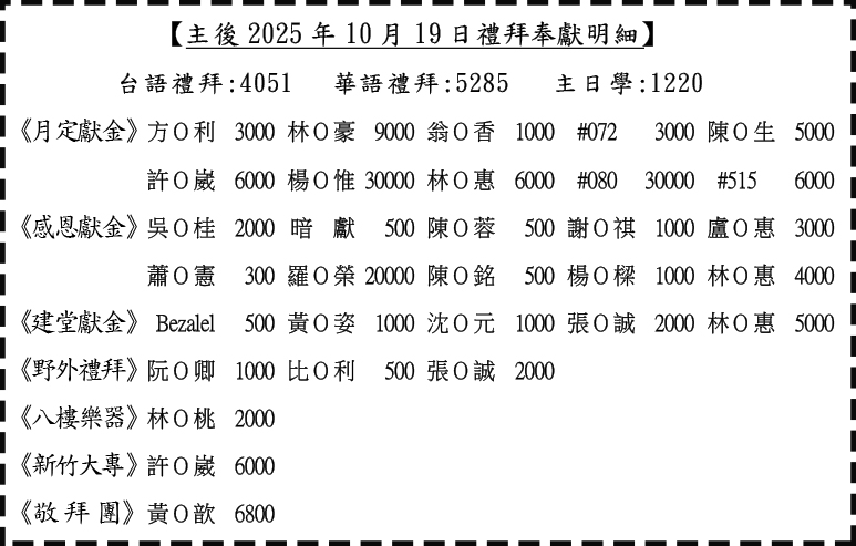 ※請兄姊為野外禮拜專款奉獻。若有其他疑問,請洽詢教會辦公室。