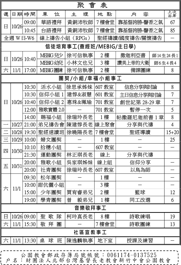 - 基要真理課程本主日(10/26)下午12:30在601教室,第5課「洗禮與聖餐」,主理:羅茂榮弟兄,第6課「成為上帝家裡的人」、第7課「重尋你人生價值」,主理:陳逸麟執事。
