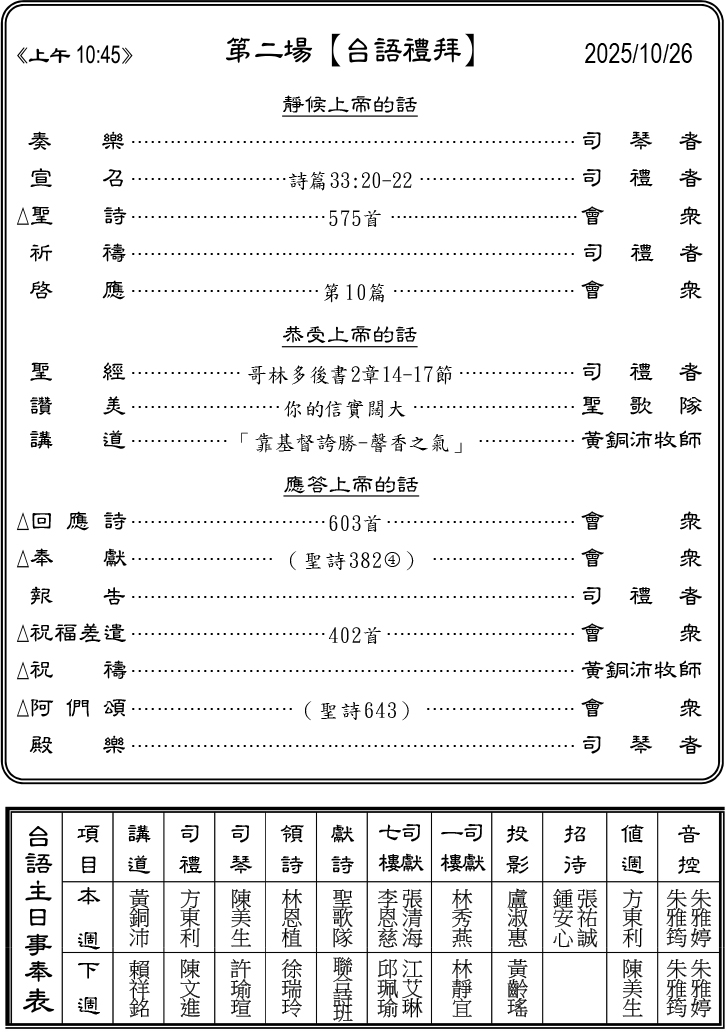 - 基要真理課程本主日(10/26)下午12:30在601教室,第5課「洗禮與聖餐」,主理:羅茂榮弟兄,第6課「成為上帝家裡的人」、第7課「重尋你人生價值」,主理:陳逸麟執事。
