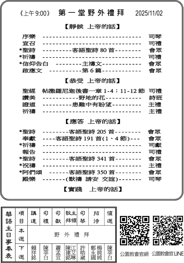 1. 本主日(11/2)舉行2025野外禮拜,在馬偕博士親自建立的獅潭教會,與獅潭教會眾兄姊同心敬拜,願榮耀歸於上帝。