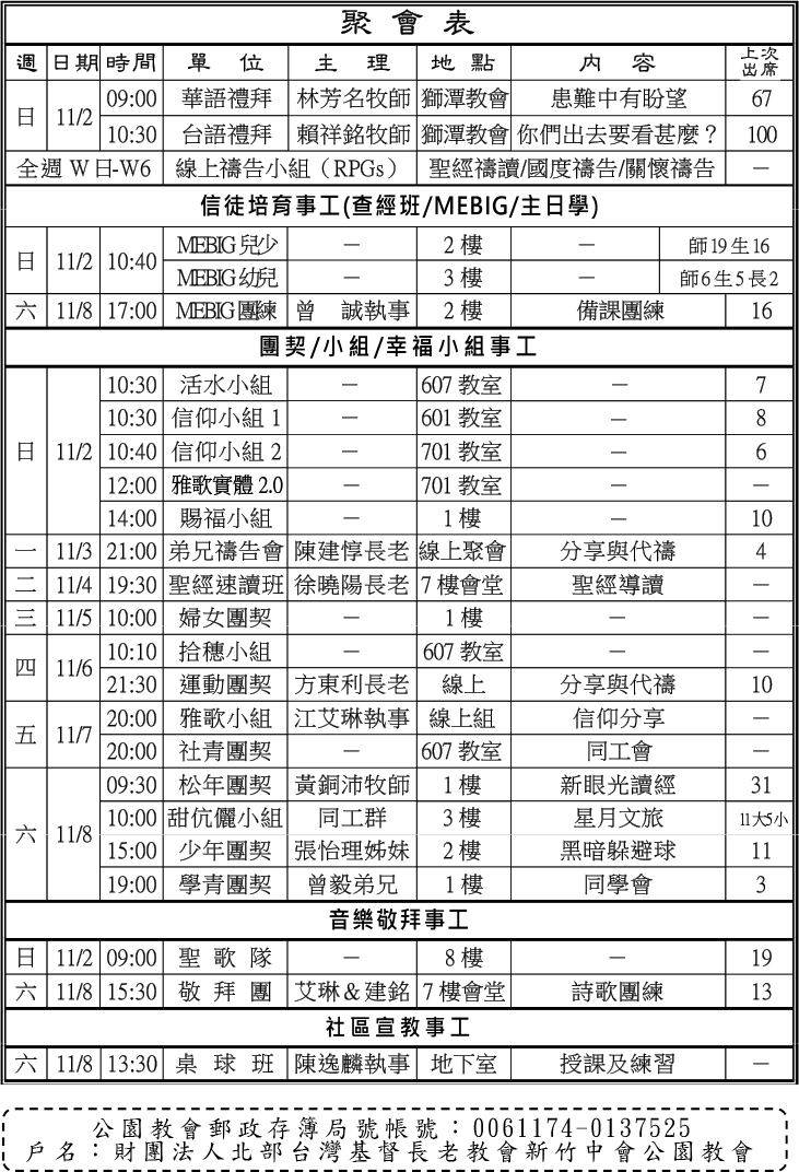 5)本主日(11/2)公園教會光復路會堂暫停主日禮拜一週。